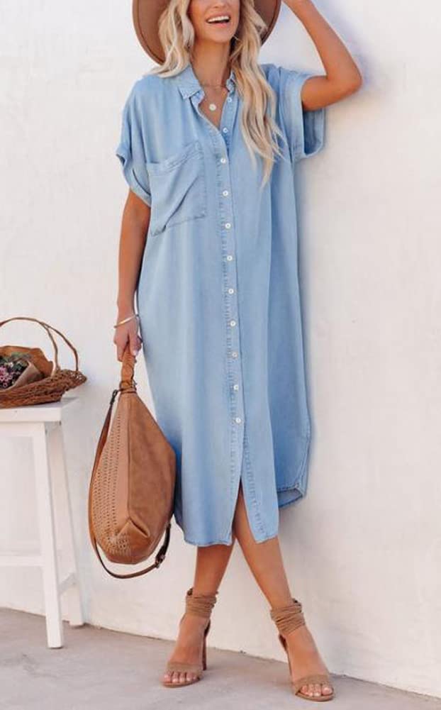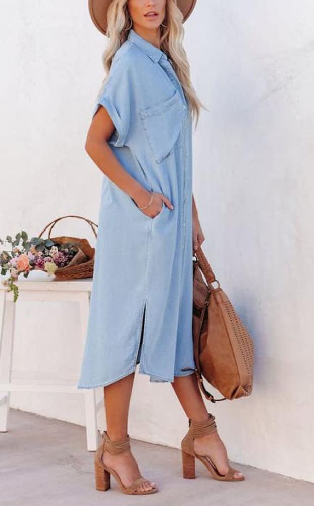 Midi-length denim dress with side slits, 2 side-entry hand pockets, 1 large chest pocket, single-breasted front button closure, round shirt hem.