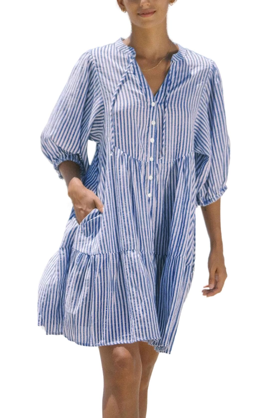Mid-length striped shirt dress with pockets for easy wearing, tiered ruffled A-line hem, high waist, half-short sleeves, just above the knee length, V-neckline with ties for bow ties.