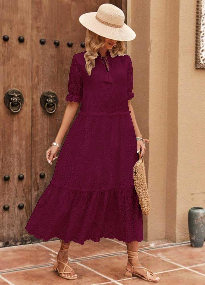 Fashionable summer dress for women, exquisite hollow cutout embroidery design, V-neck drawstring, short sleeve elastic cuffs, A-line silhouette, knee-length.