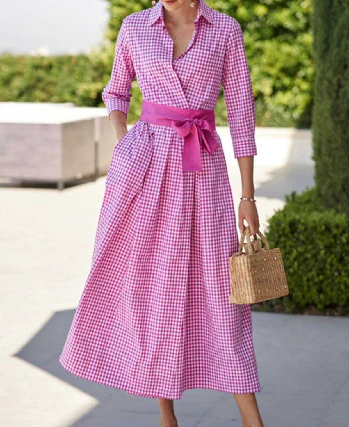 Fashionable plaid shirt dress with belt, retro plaid print pattern, classic A-line silhouette, slim shirt dress to cover tummy/abdomen/belly fat.